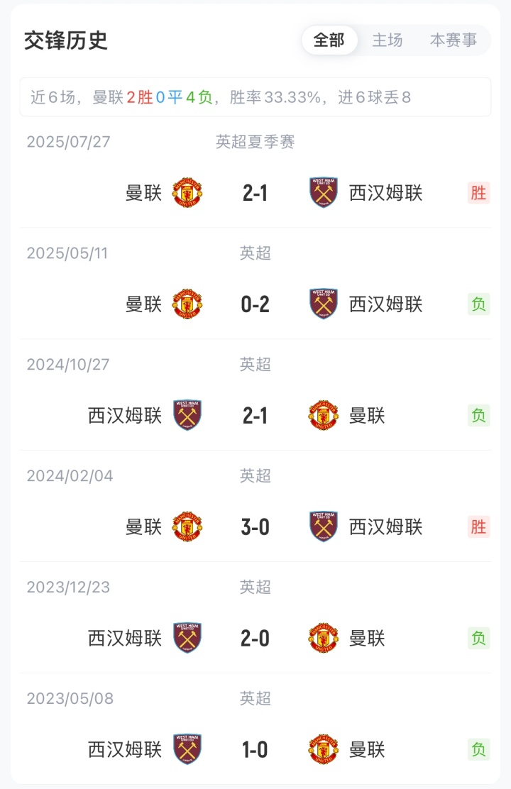 曼联联赛6胜3平4负积21分暂位英超第9,近4轮仅1胜;西汉姆联联赛3胜2平8负积11分暂位英超第18,近2轮不胜。曼联上赛季遭西汉姆联双杀。