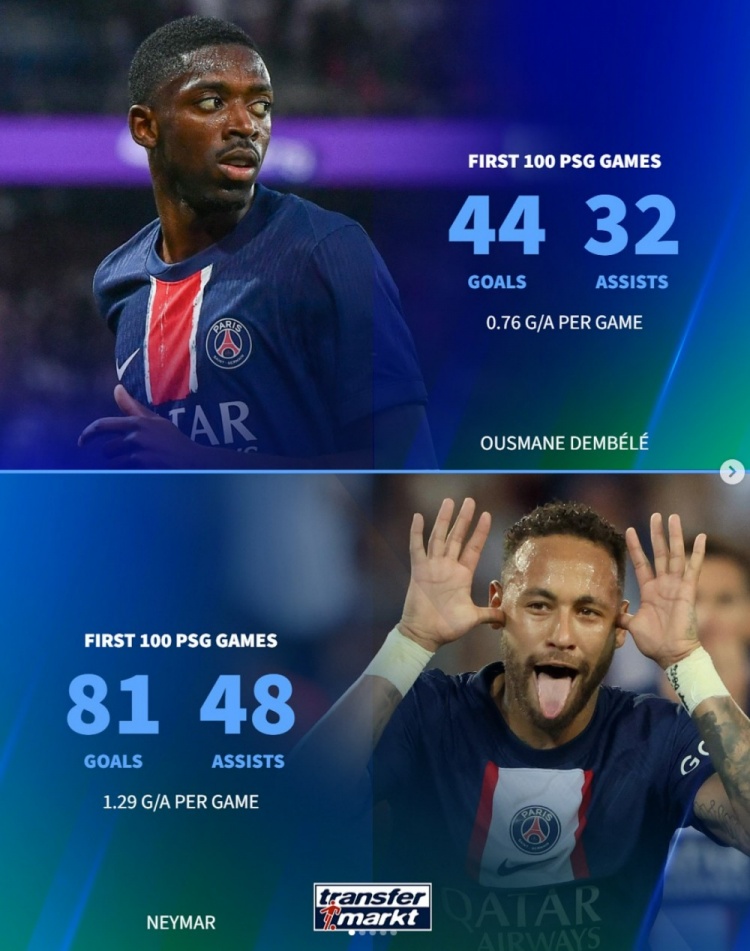 10月22日讯 在本轮欧冠巴黎7-2击败勒沃库森的比赛中,登贝莱迎来巴黎生涯100场里程碑,德转也对比了登贝莱与内马尔、伊布、姆巴佩等人在巴黎前100场参与进球数据: