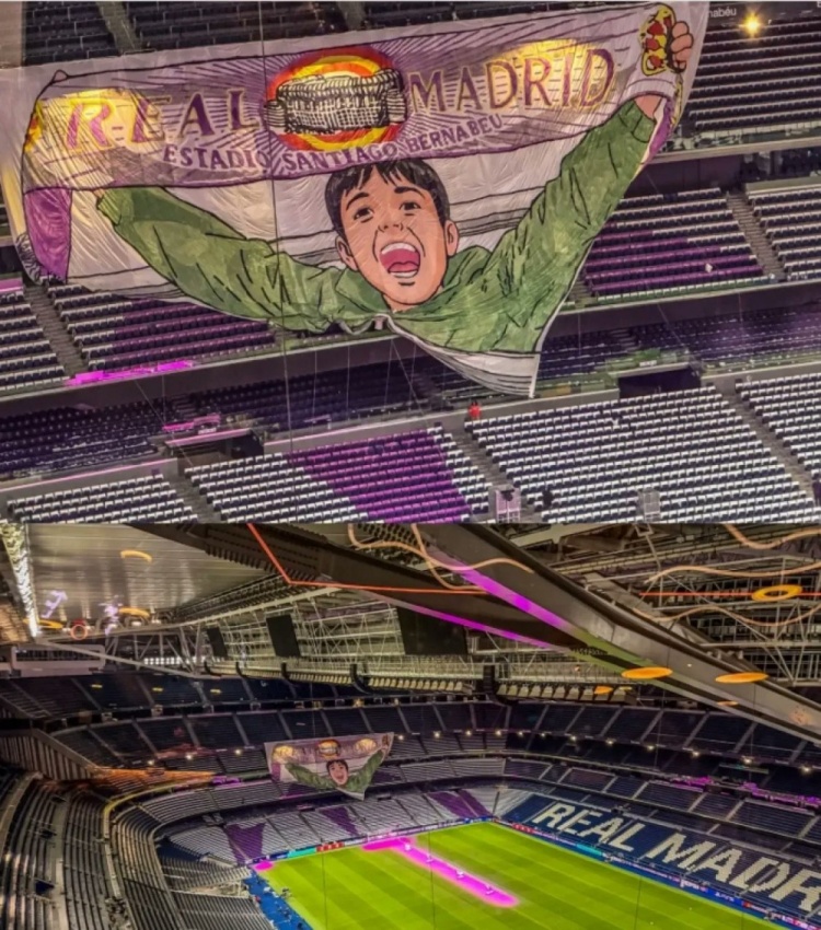 TIFO内容为巴斯克斯2017年在国家德比之前社媒发布的照片,少年时期的巴斯克斯高举皇马围巾。